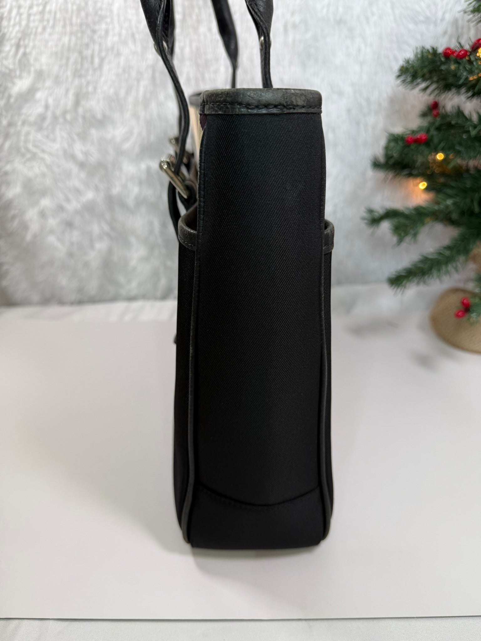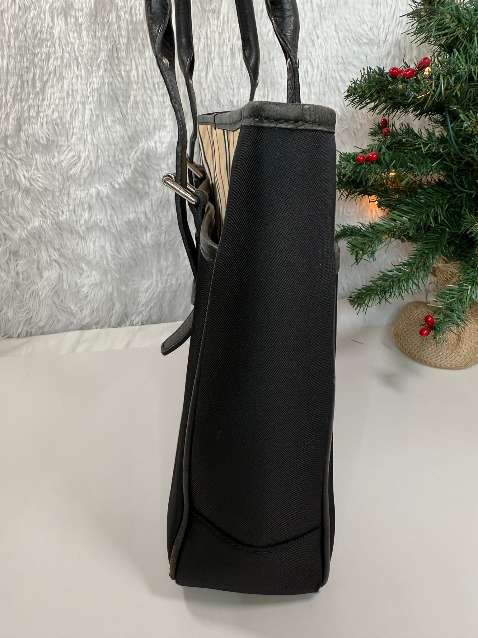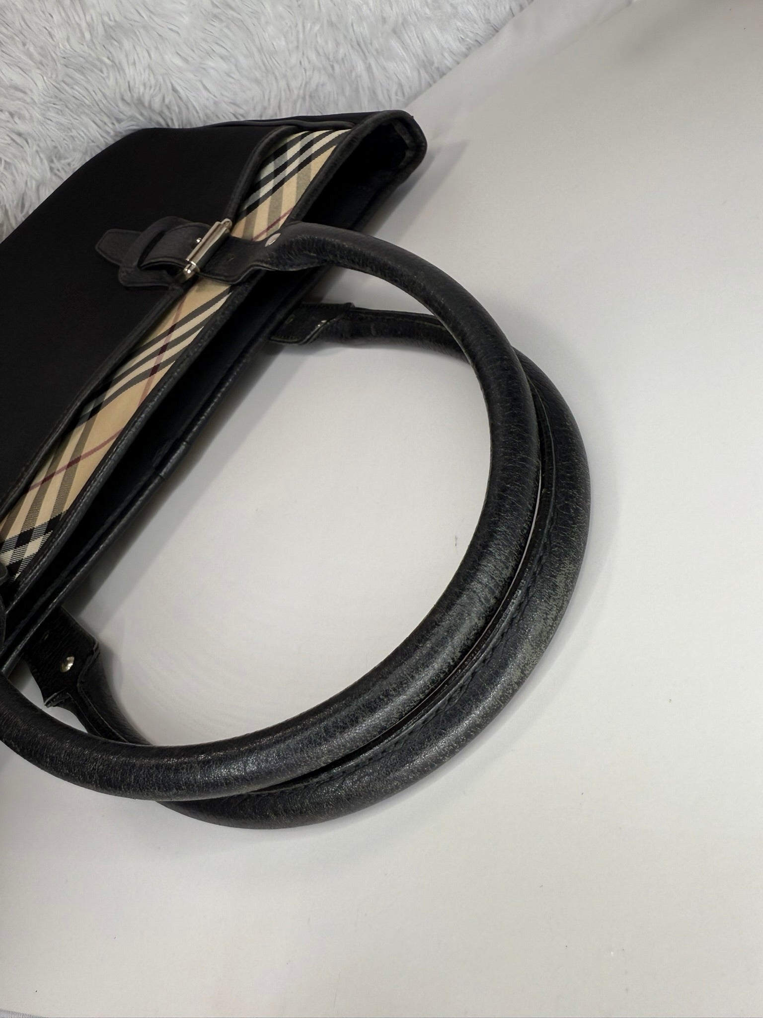 The BURBERRY Nova Check Tote Bag is a sturdy and spacious work bag, perfect for the daily commute. Despite some wear around the edges and discoloration on the leather handles, the bag remains structurally intact and has a long usable life ahead. A great investment for any professional.