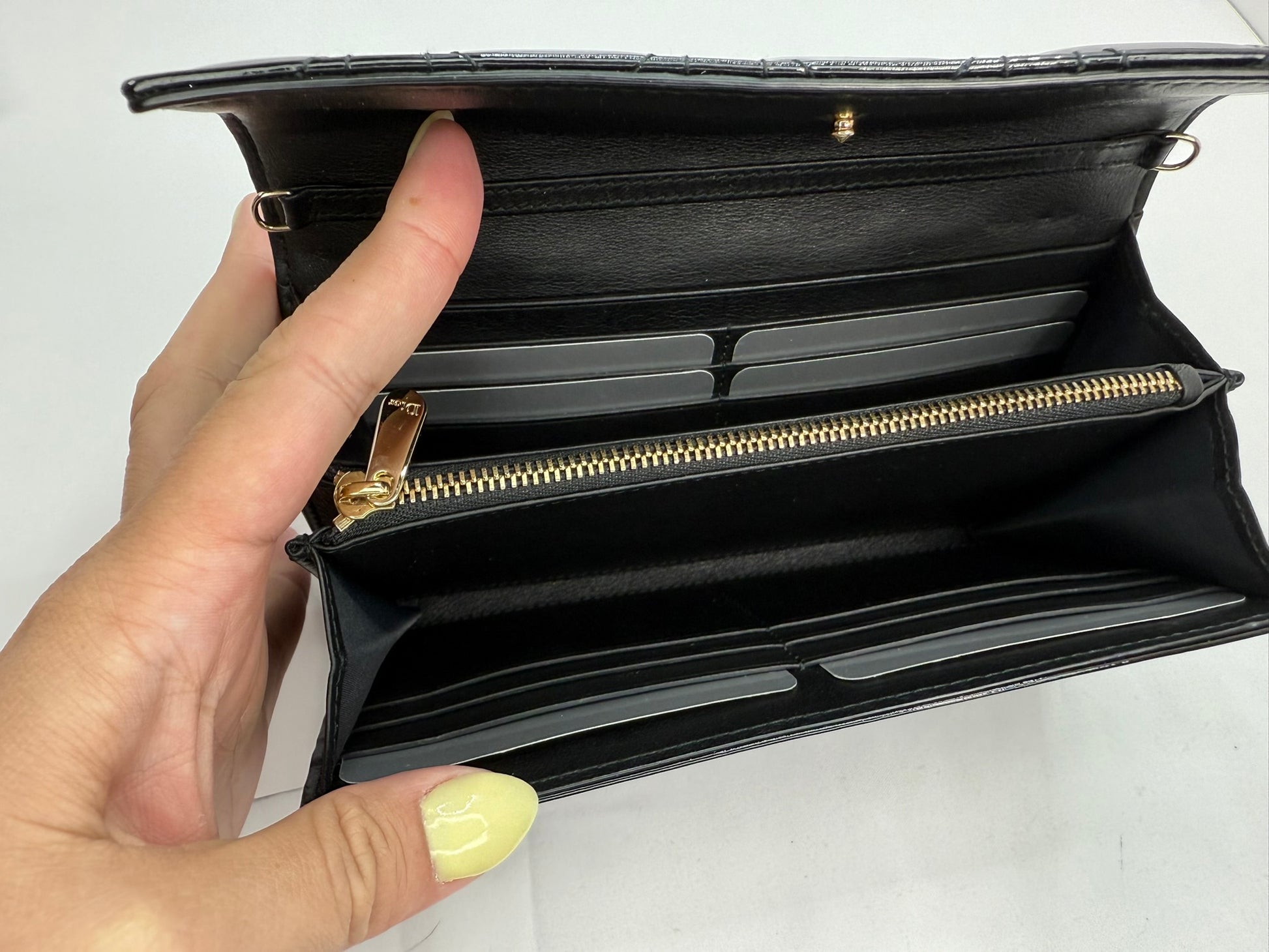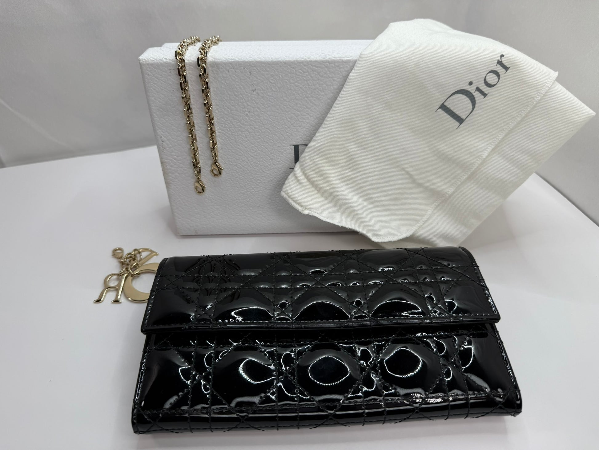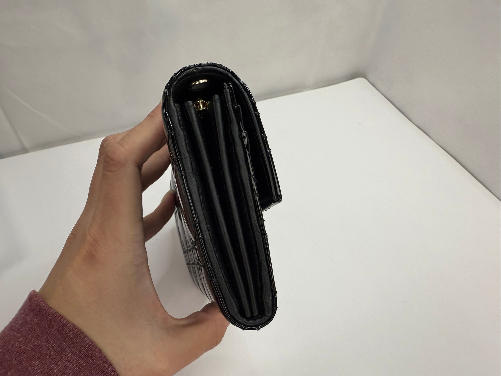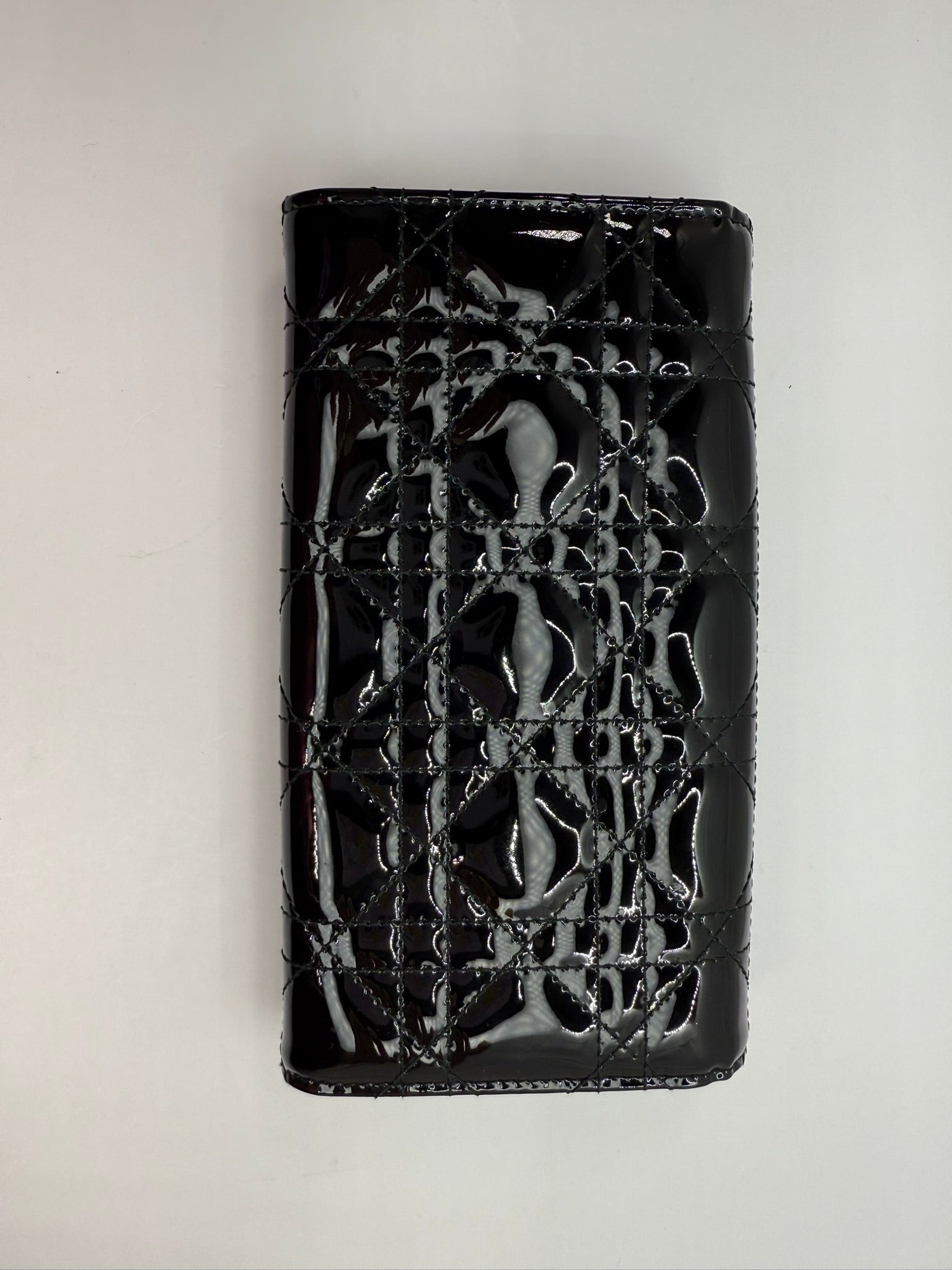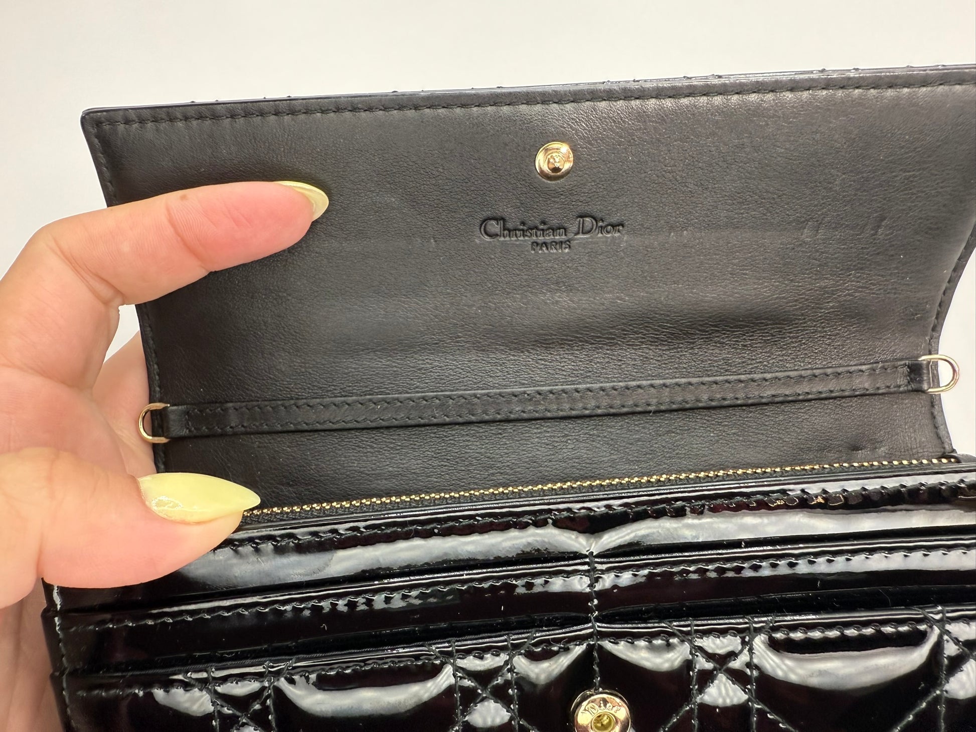 This DIOR Cannage clutch, crafted from patent leather, offers a sleek and polished finish. Its compact design allows it to be used effortlessly as a clutch or a wallet, combining elegance with practicality for versatile everyday use.