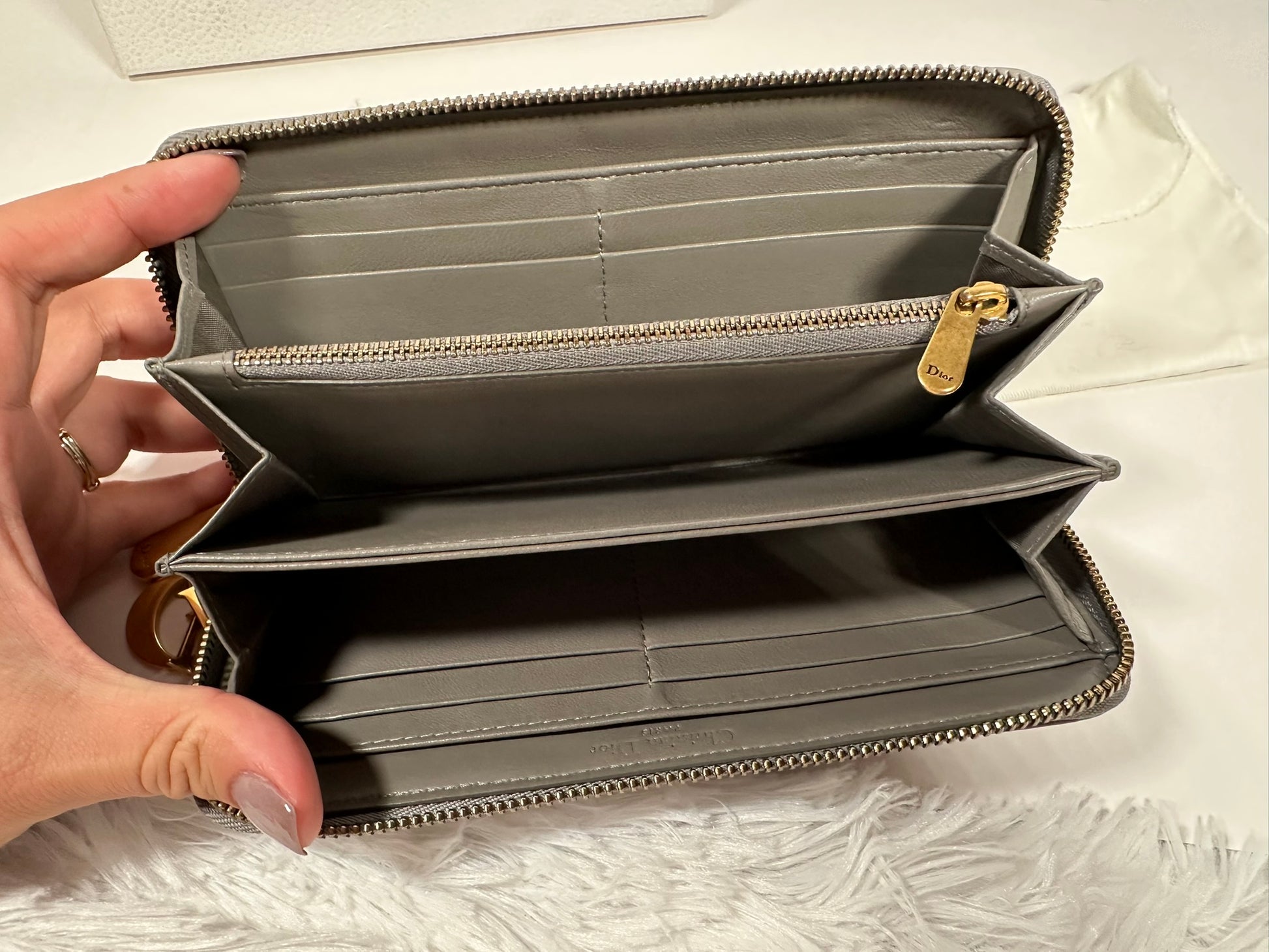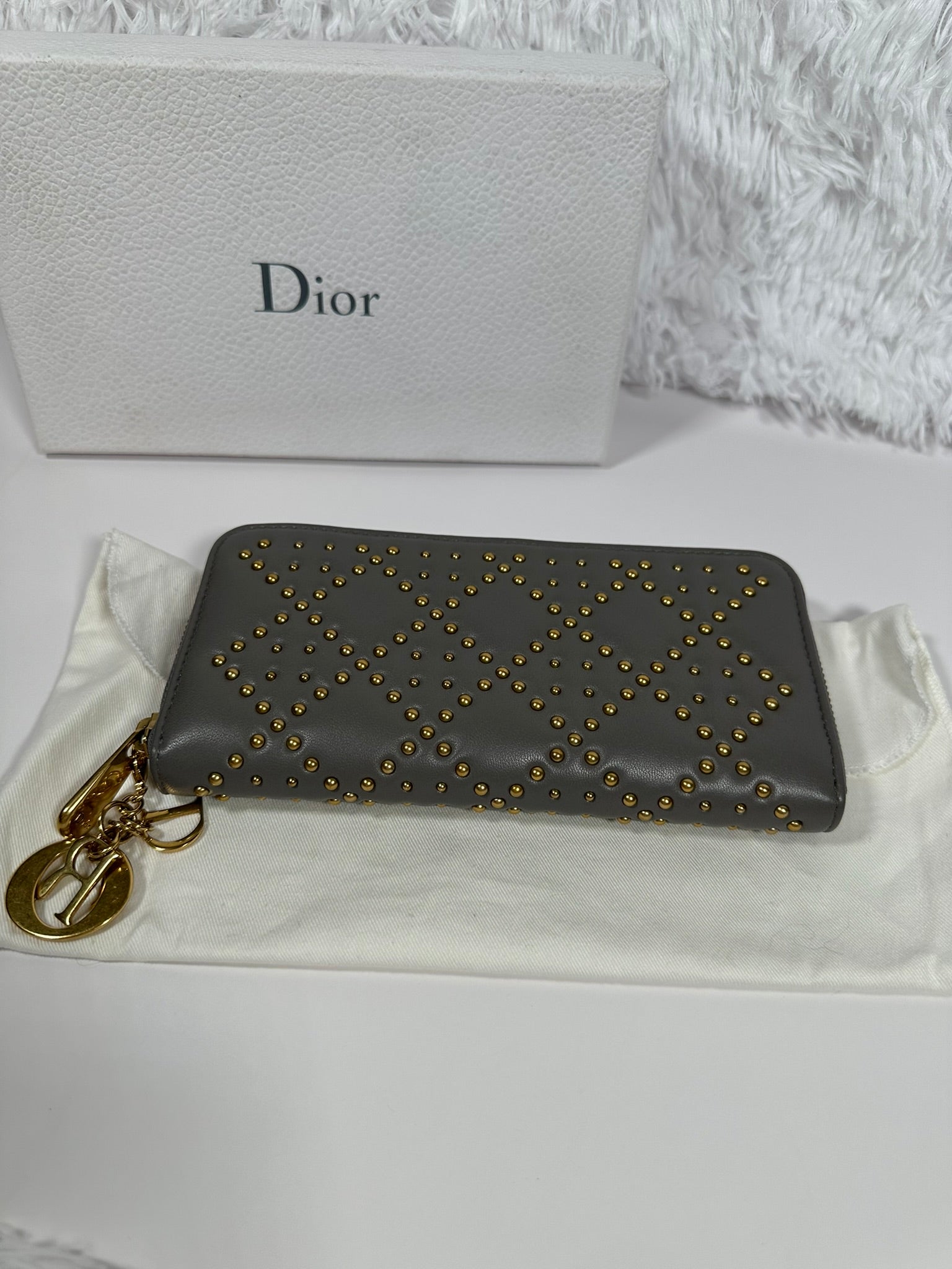 Expertly crafted and stylish, the DIOR Gray Long Zippy Wallet is the perfect accessory for any outfit. Made with high quality materials, this wallet is both durable and elegant. With its full set of features including gold studded details and no major signs of wear, this wallet is sure to make a statement. Don't wait, get yours now!