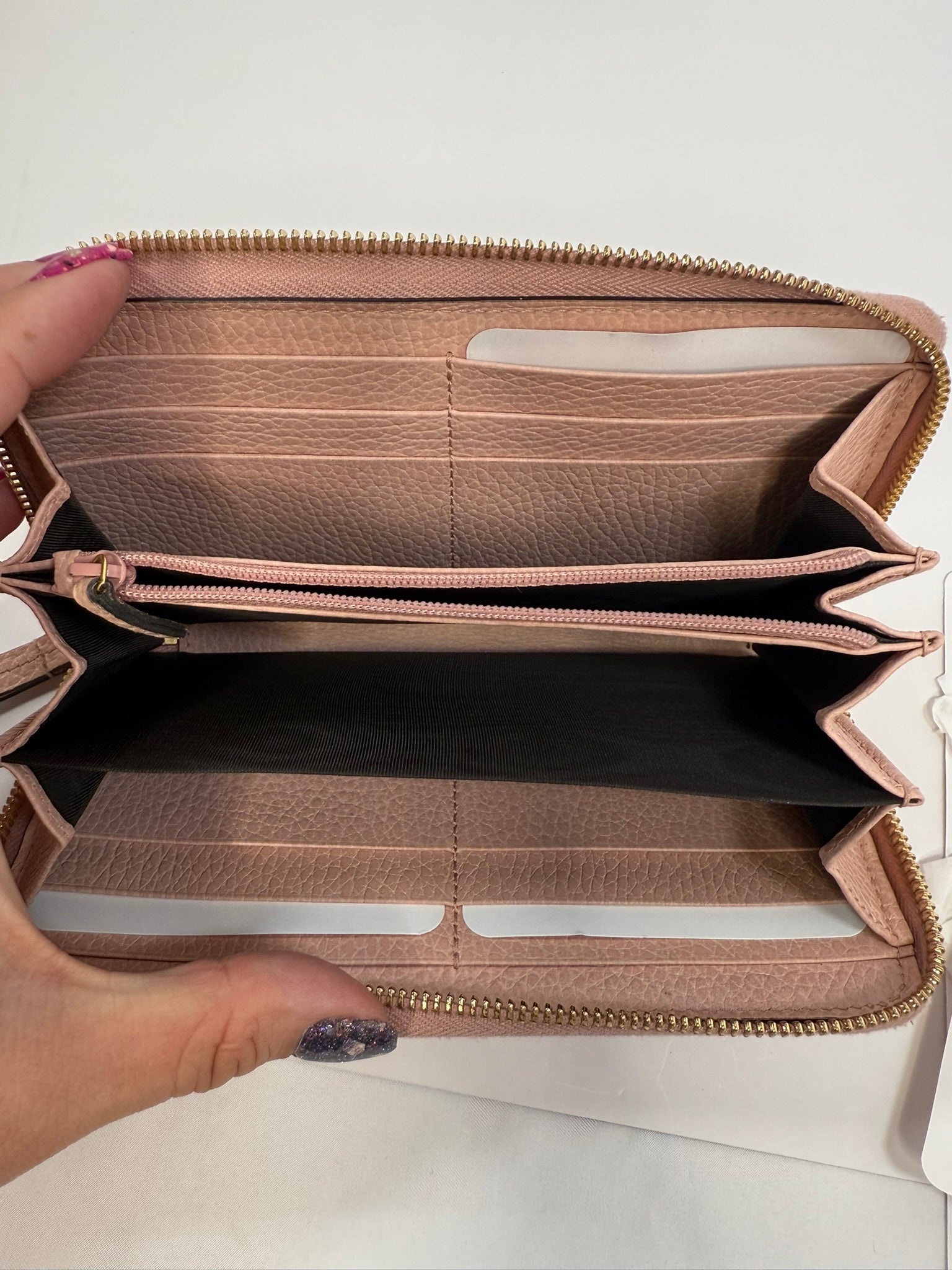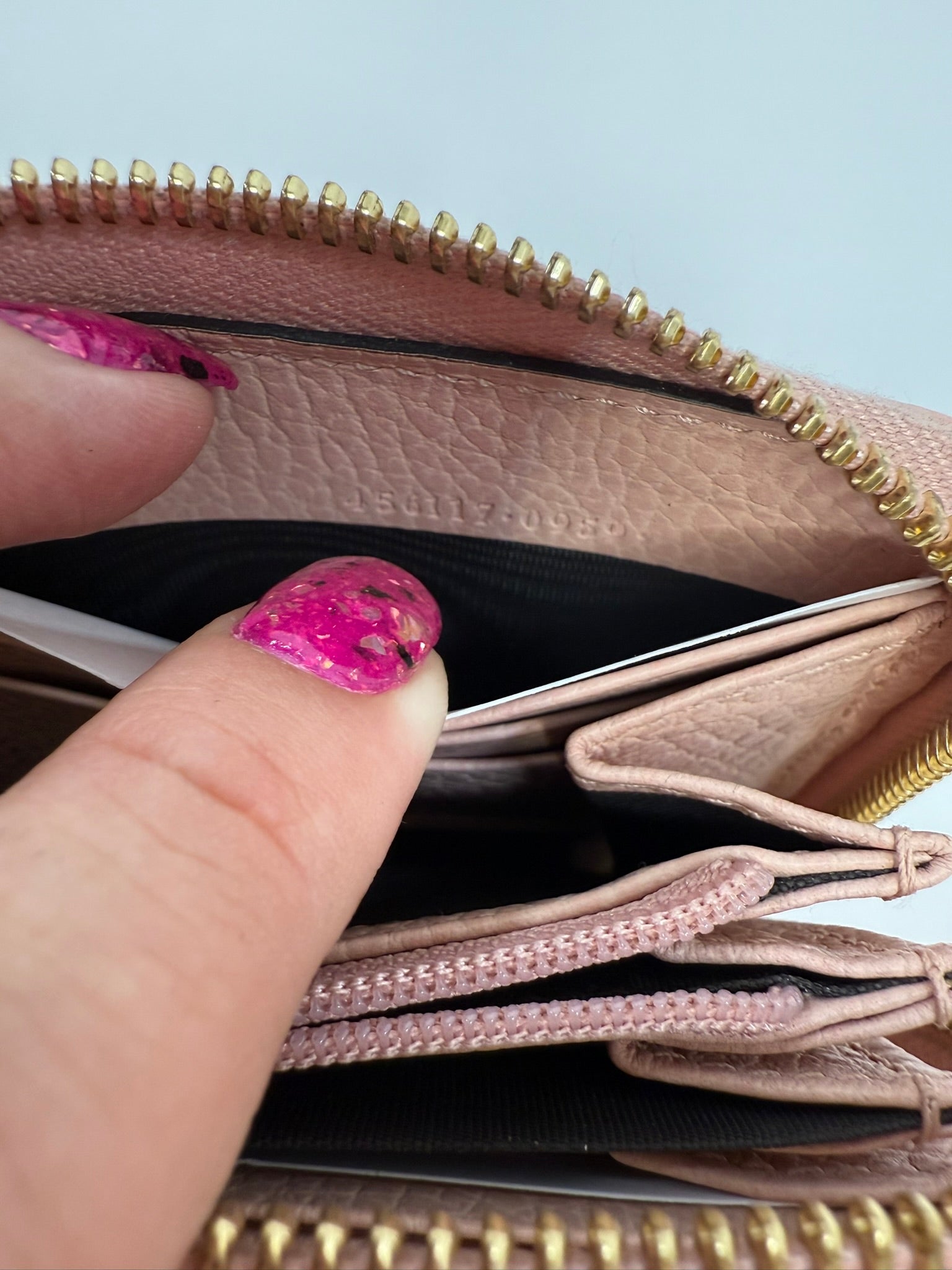Add a touch of luxury to your everyday essentials with the GUCCI Calfskin Wallet in Pink. Made with high-quality calfskin, this wallet exudes elegance and sophistication. While the canvas may show some minor discoloration, it comes with a dust bag for safekeeping. Review all images before purchasing, as all sales are final.