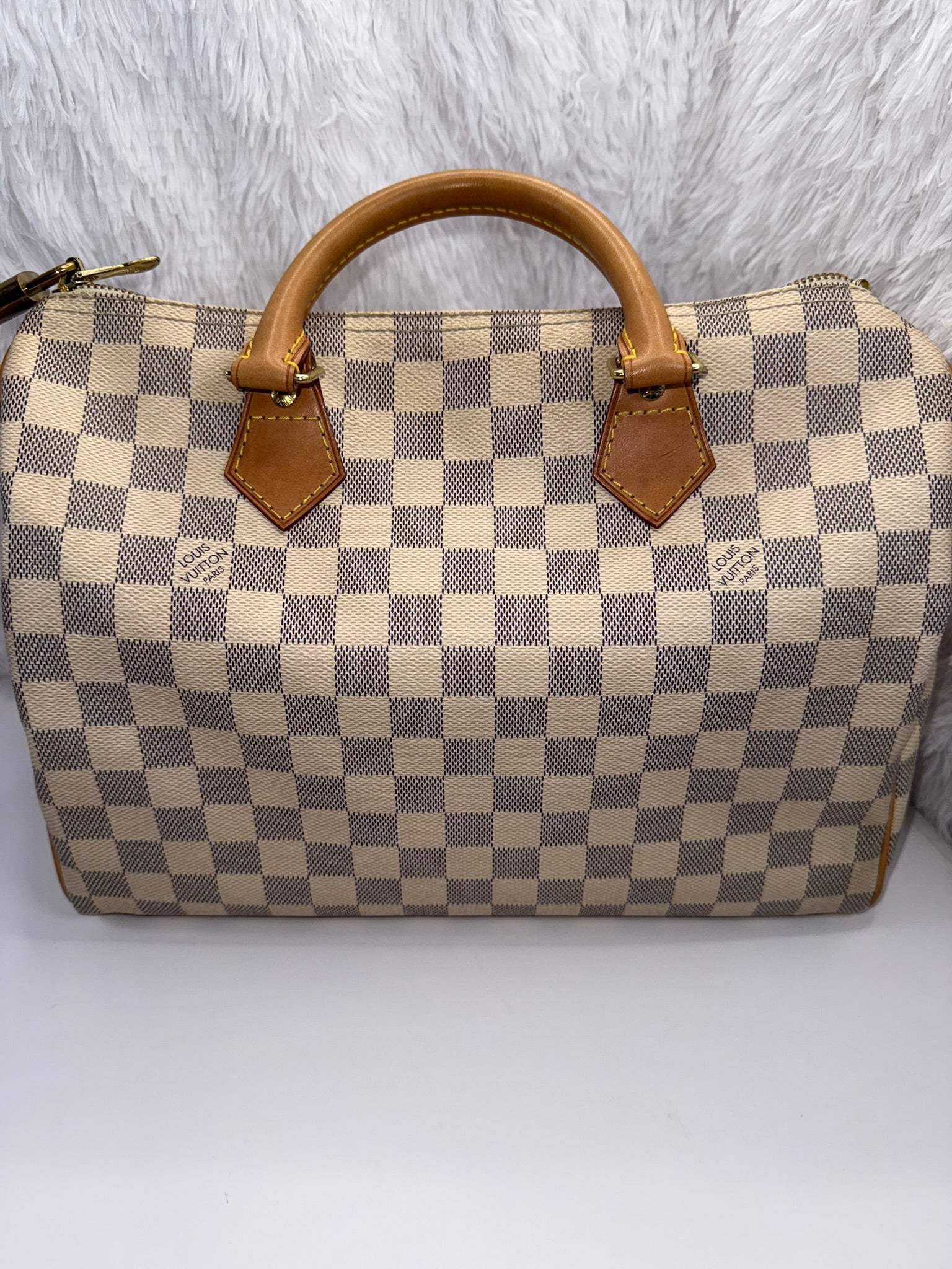As a renowned staple in designer fashion, the LOUIS VUITTON SPEEDY 30 BANDO DAMIER AZUR offers gorgeous style with slight wear on the corners. With a clean and organized interior, this bag also includes a convenient organizer and lock and keys for added security. Please review all images for the condition of the item as all sales are final.