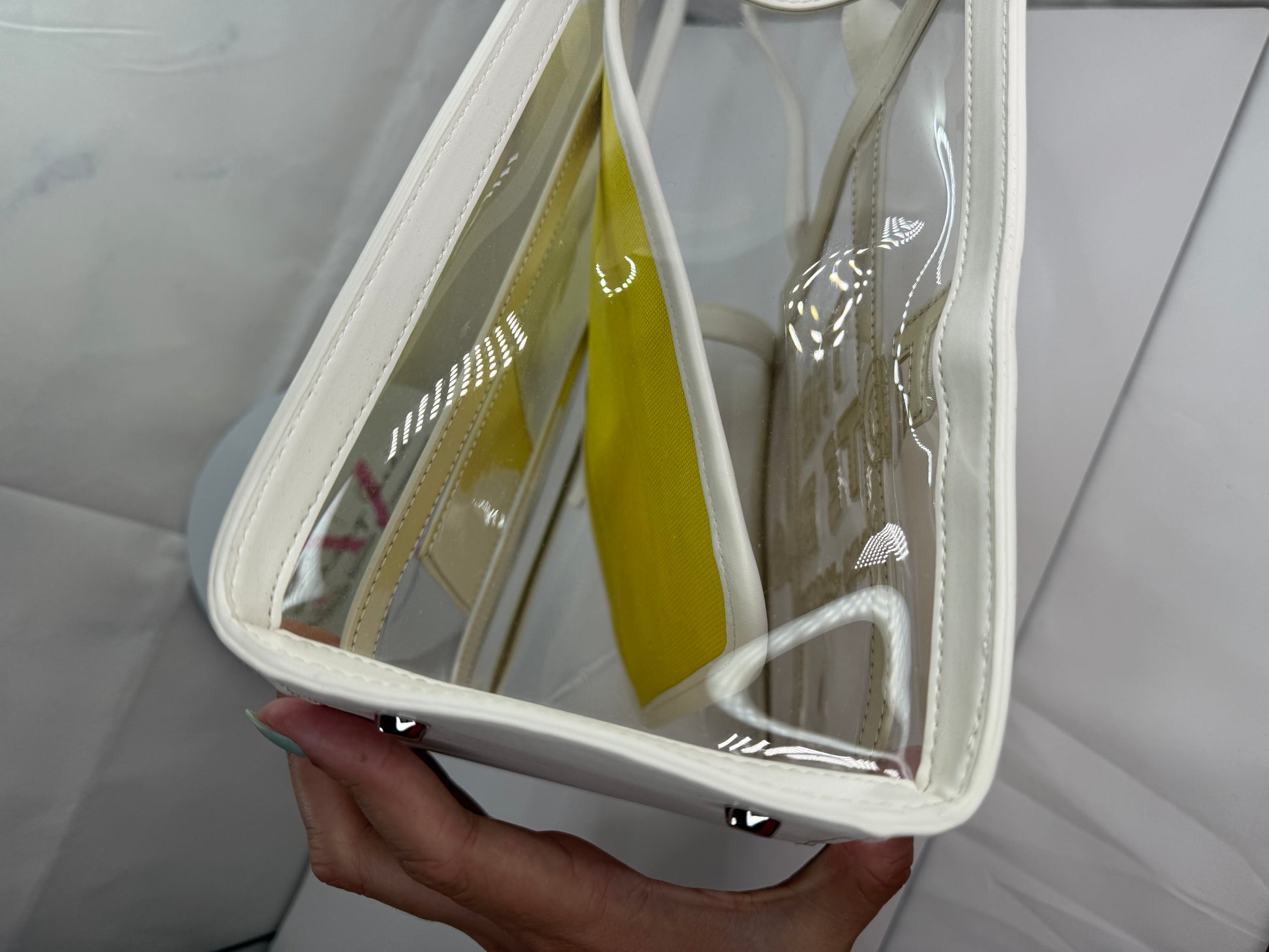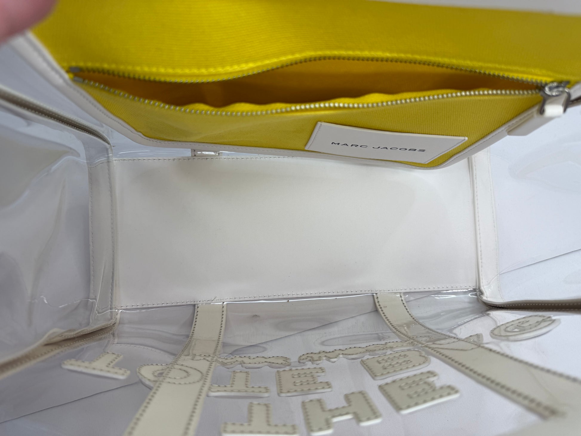 Expertly designed by MARC JACOBS, The Tote Bag is the perfect tote for all your summer needs. This clear tote bag is not only gorgeous, but also functional with its vibrant yellow accent. Use it for the beach or pool, or make a fashion statement anywhere you go.