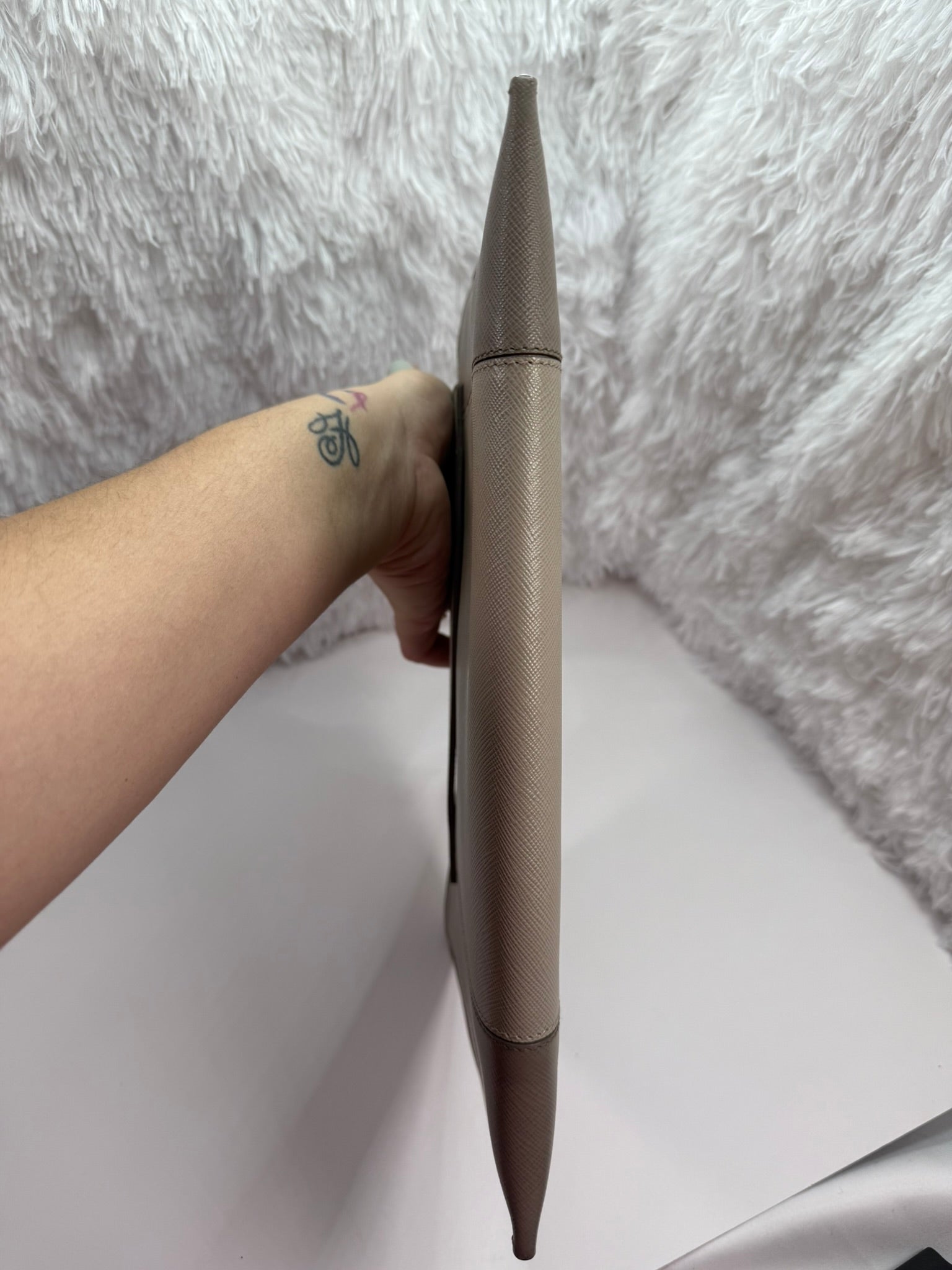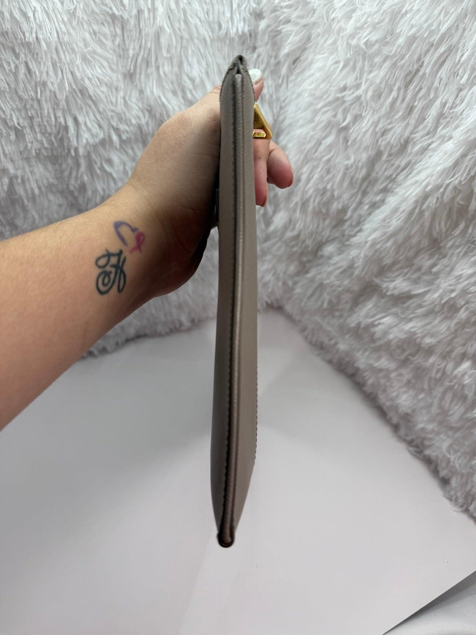 Upgrade your accessory game with the PRADA Saffiano Clutch Pouch. This stunning clutch features a built-in handle for easy carrying. The full leather interior is not only luxurious but also includes a Prada Authenticity card for peace of mind. With its sleek design, you'll make a statement at any event.