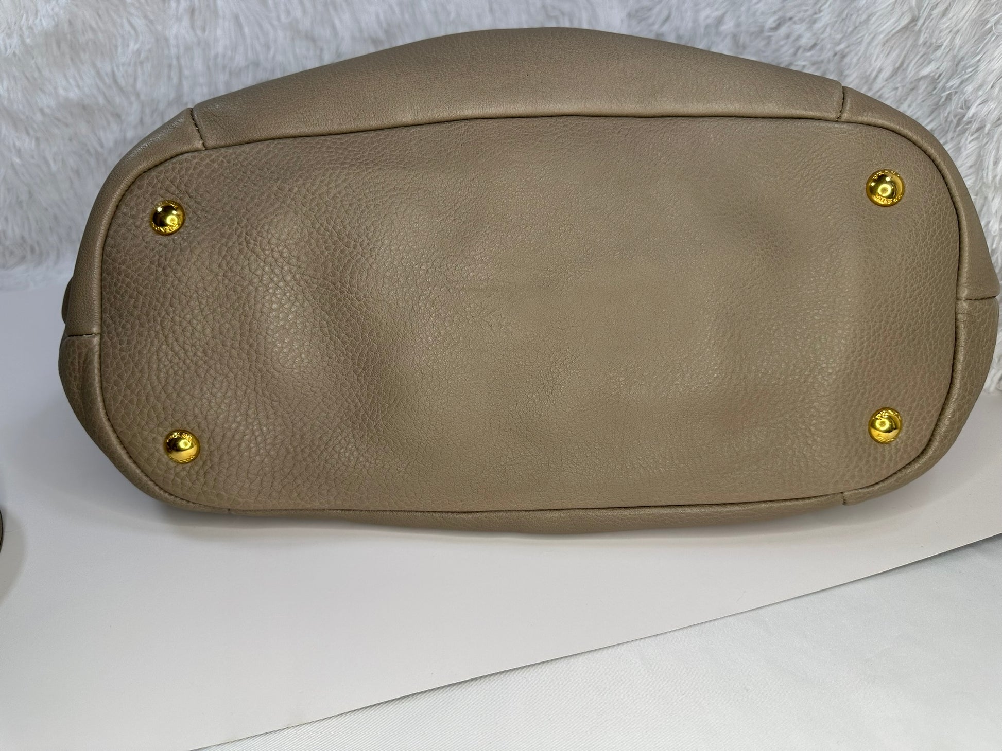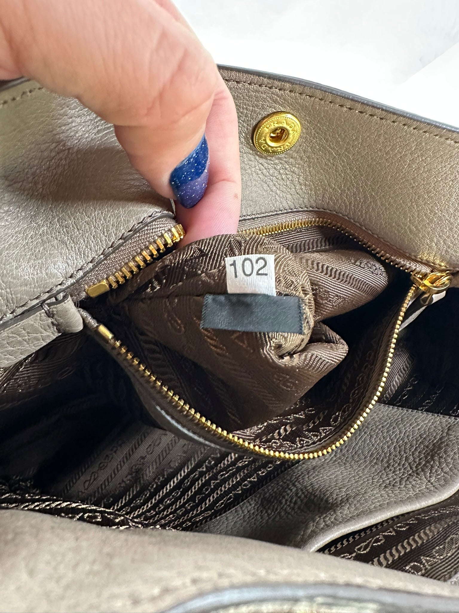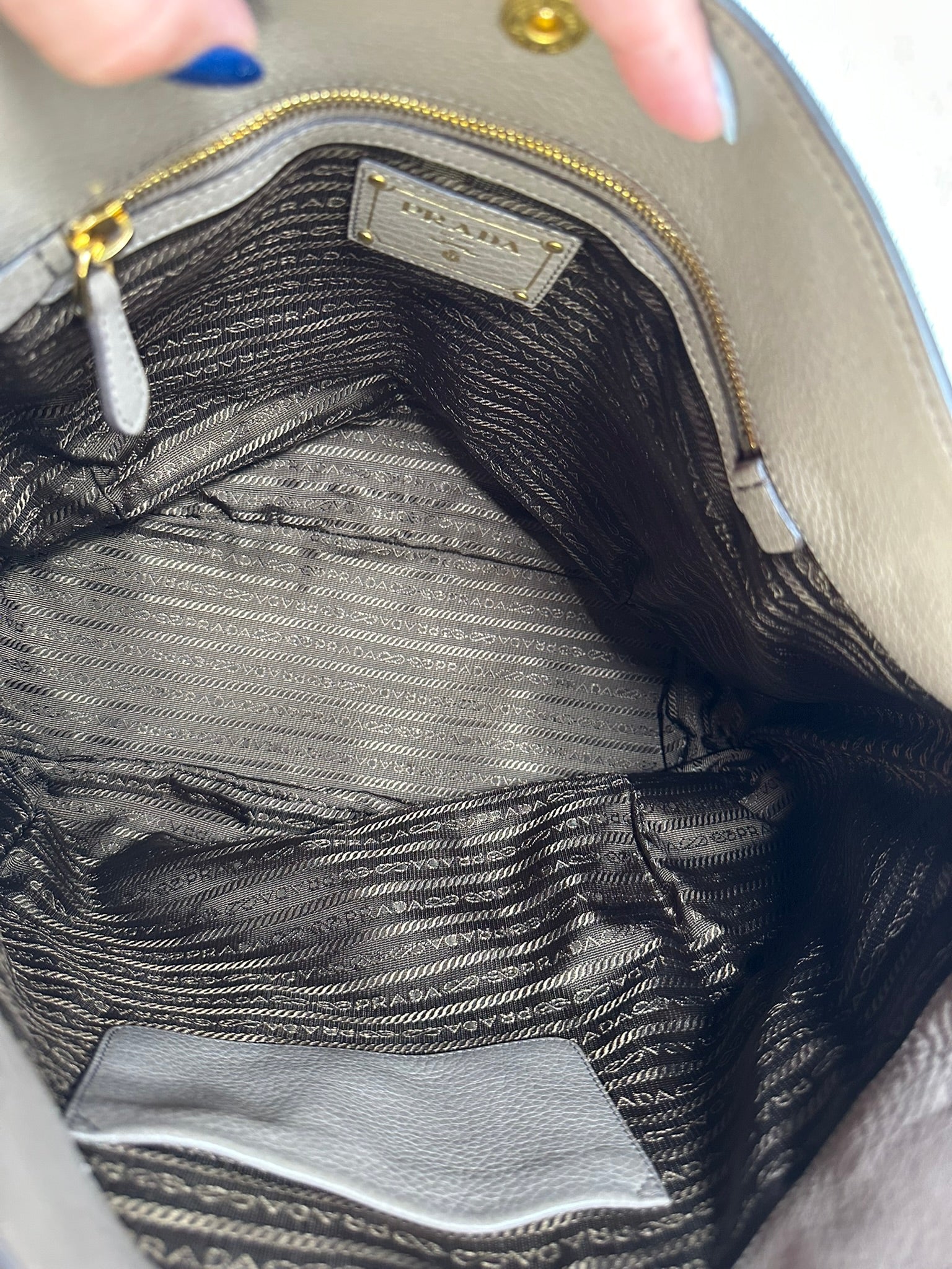The PRADA Vitello Daino 2 Way Handbag offers versatility with two ways to carry and a crossbody strap. With its large size, it can also double as a spacious weekend bag. Despite one faint scratch on the back, it remains in great condition. Elevate your style and functionality with this handbag.