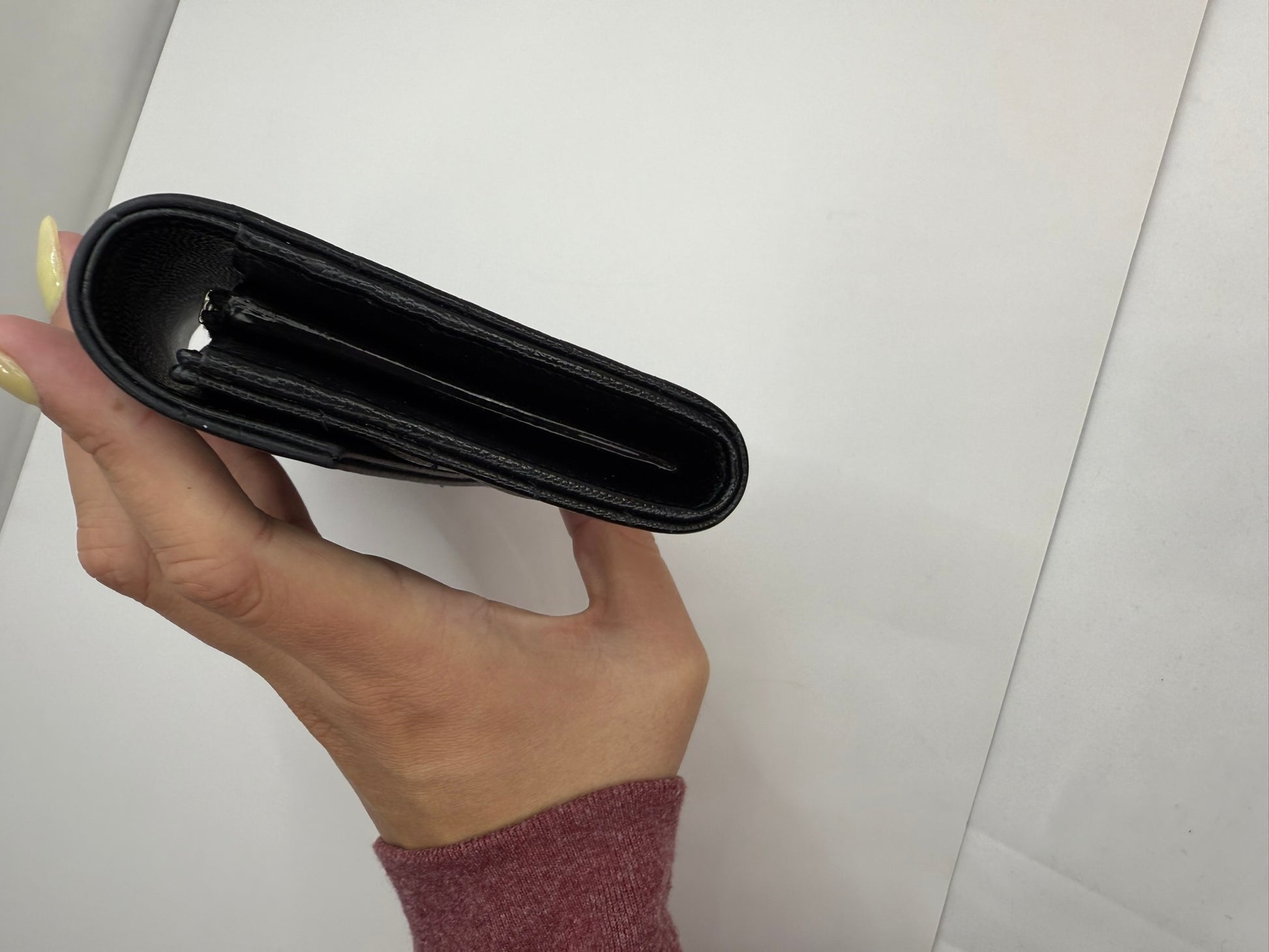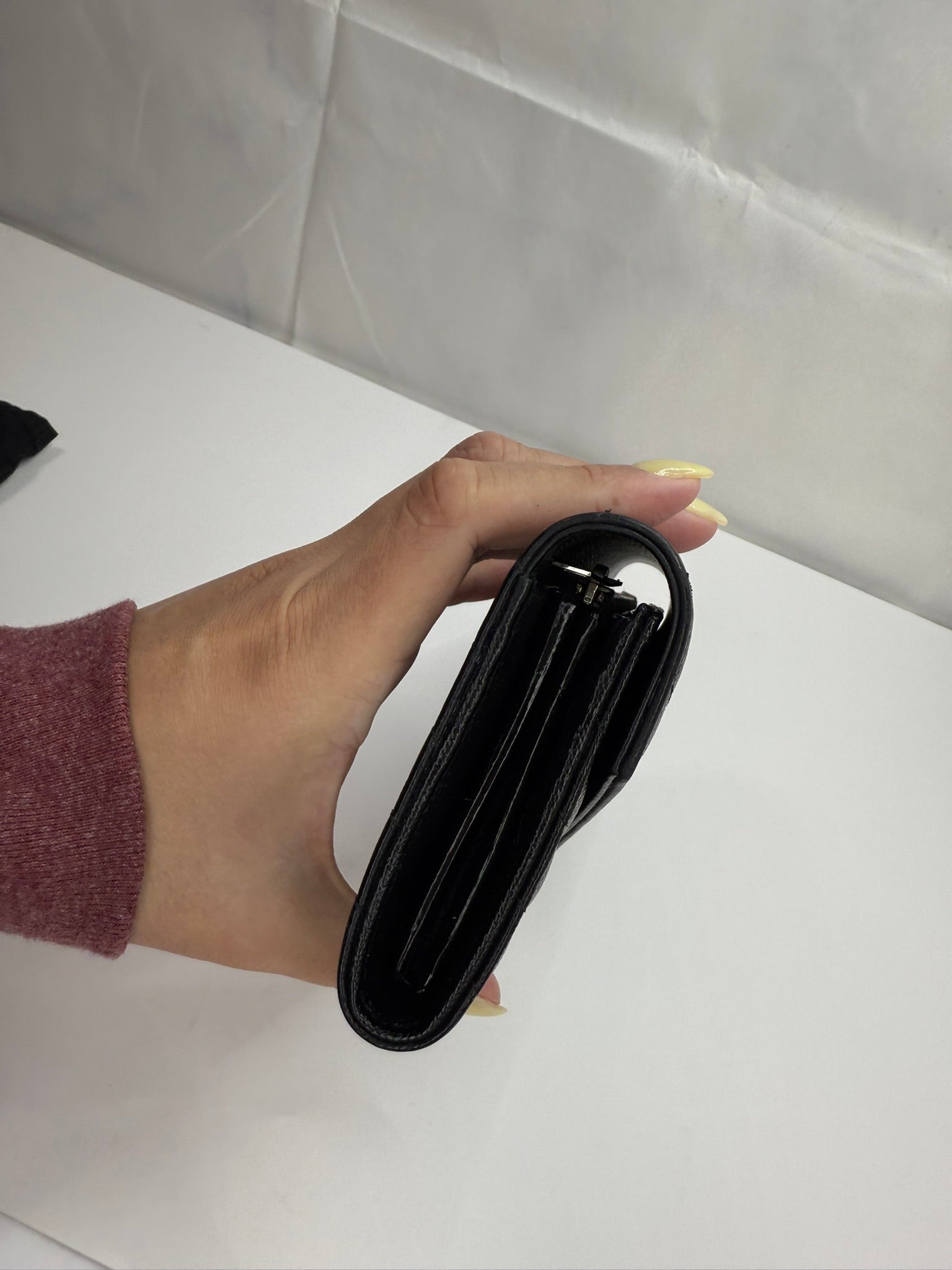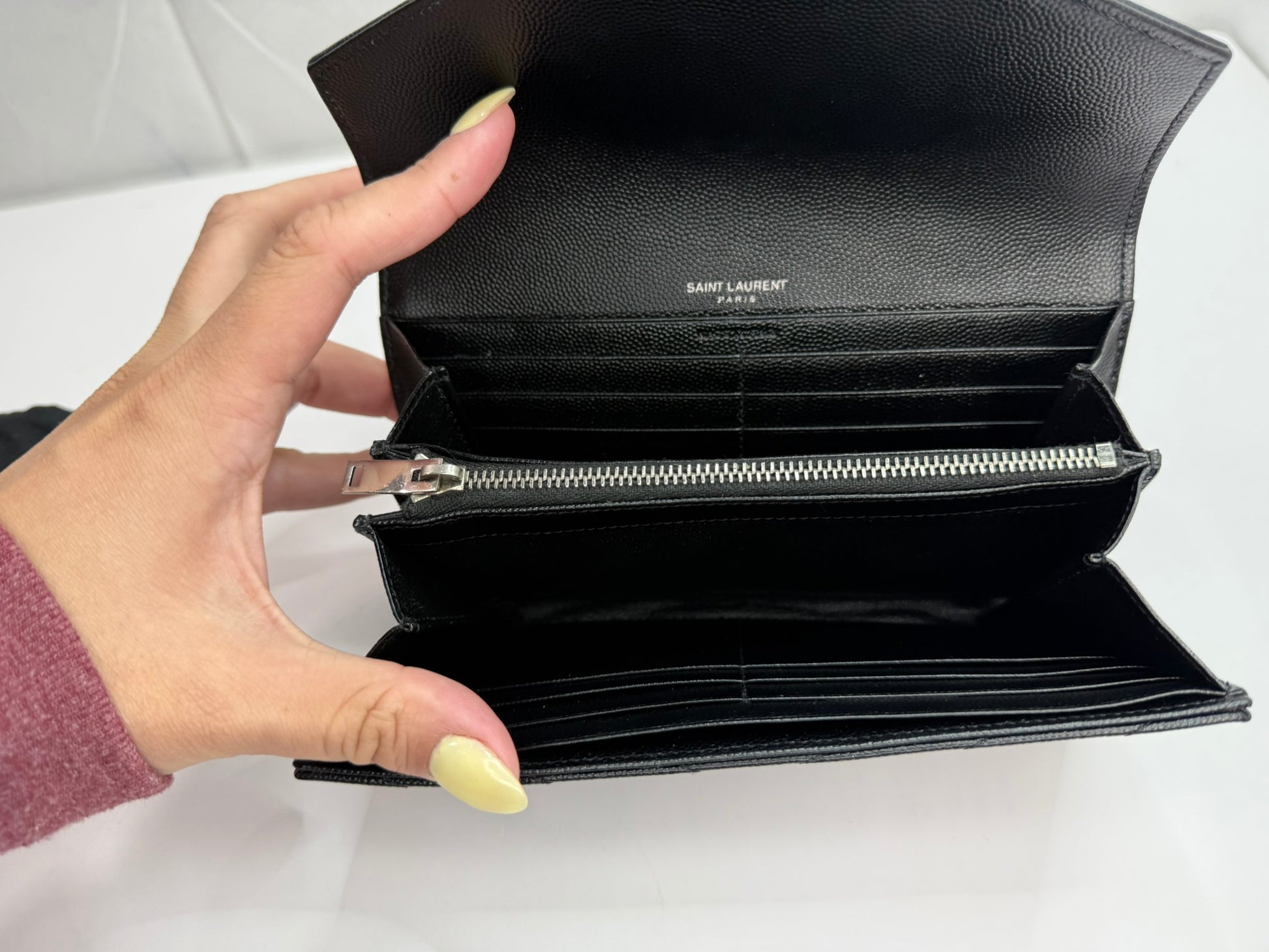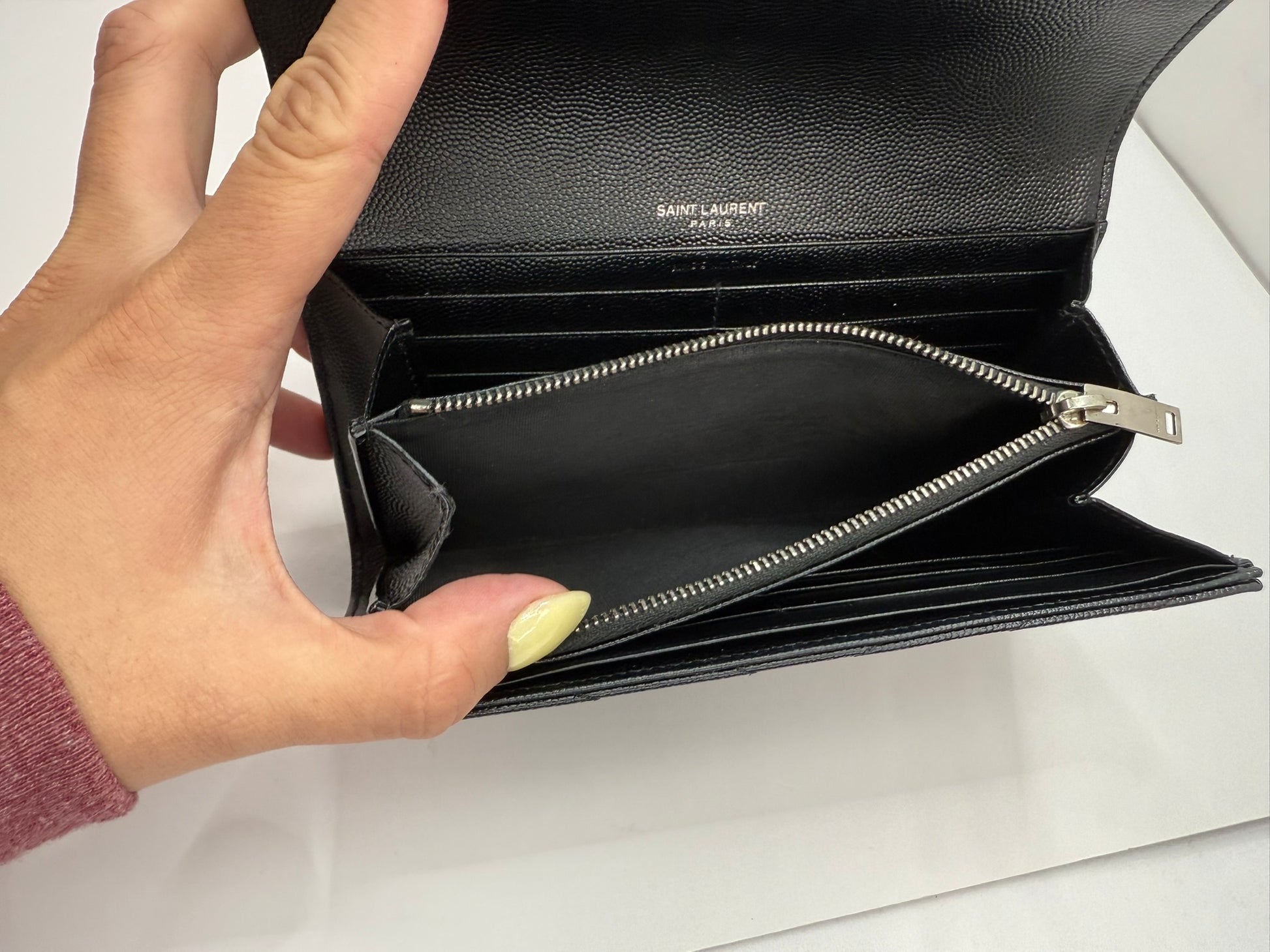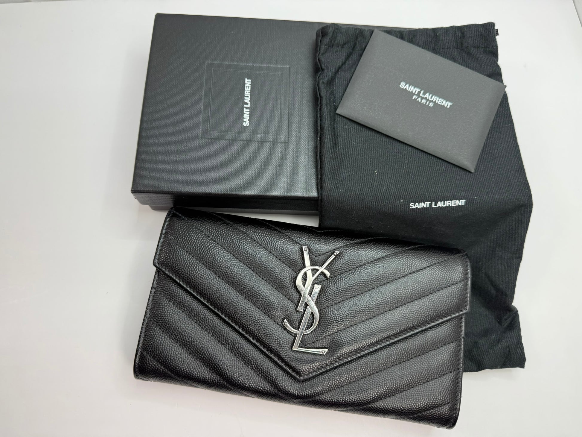 This Saint Laurent Grain De Poudre Matelasse Chevron Monogram Flap Wallet in black combines timeless elegance with practical design. Crafted with signature chevron quilting, it includes a crossbody strap and a conversion insert for versatile wear. Despite minor rubbing on the edge, it comes as a full set with the original box, dustbag, and authenticity cards, ensuring a complete luxury experience. Perfect for those seeking both style and functionality in a compact accessory.